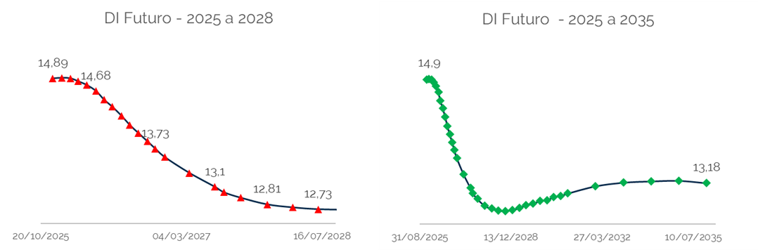 O mercado parece ter uma leitura análoga. A curva de DI Futuro, em diversos vértices, demonstra uma precificação de mercado que realmente sinalizam uma queda.